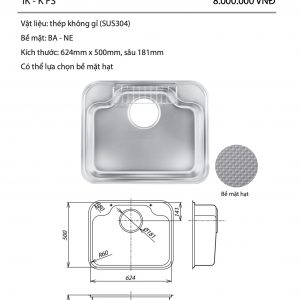 Kích thước lòng chậu: Dài 624mm x 500mm, sâu 181mm