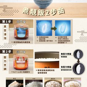 Trong quá trình nấu cơm, toàn bộ không khí trong nồi được hút đẩy ra ngoài tạo môi trường chân không và chênh lệch áp suất giúp từng lõi gạo được hấp thụ nước tối đa. Nhiệt được truyền từng hạt gạo thúc đẩy quá trình chuyển hóa tinh bột beta β cứng thành tinh bột alpha α. Quá trình chuyển hóa này giúp cải thiện độ ngọt và độ mềm dẻo của gạo sau khi nấu rất tốt cho hệ tiêu hóa.