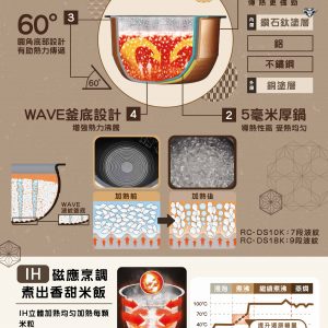 Nồi cơm điện RC-DS18K thiết kế nắp khóa kín hơi nước trong nồi bên trong để gia tăng tăng áp suất khí bên trong nồi. Bằng cách đun nóng ở nhiệt độ cao, lõi của mỗi hạt gạo được làm chín từ trong ra ngoài. Nồi có khả năng điều chỉnh áp lực sao cho gạo không bị nát khi chín và nấu cơm được tơi xốp.
